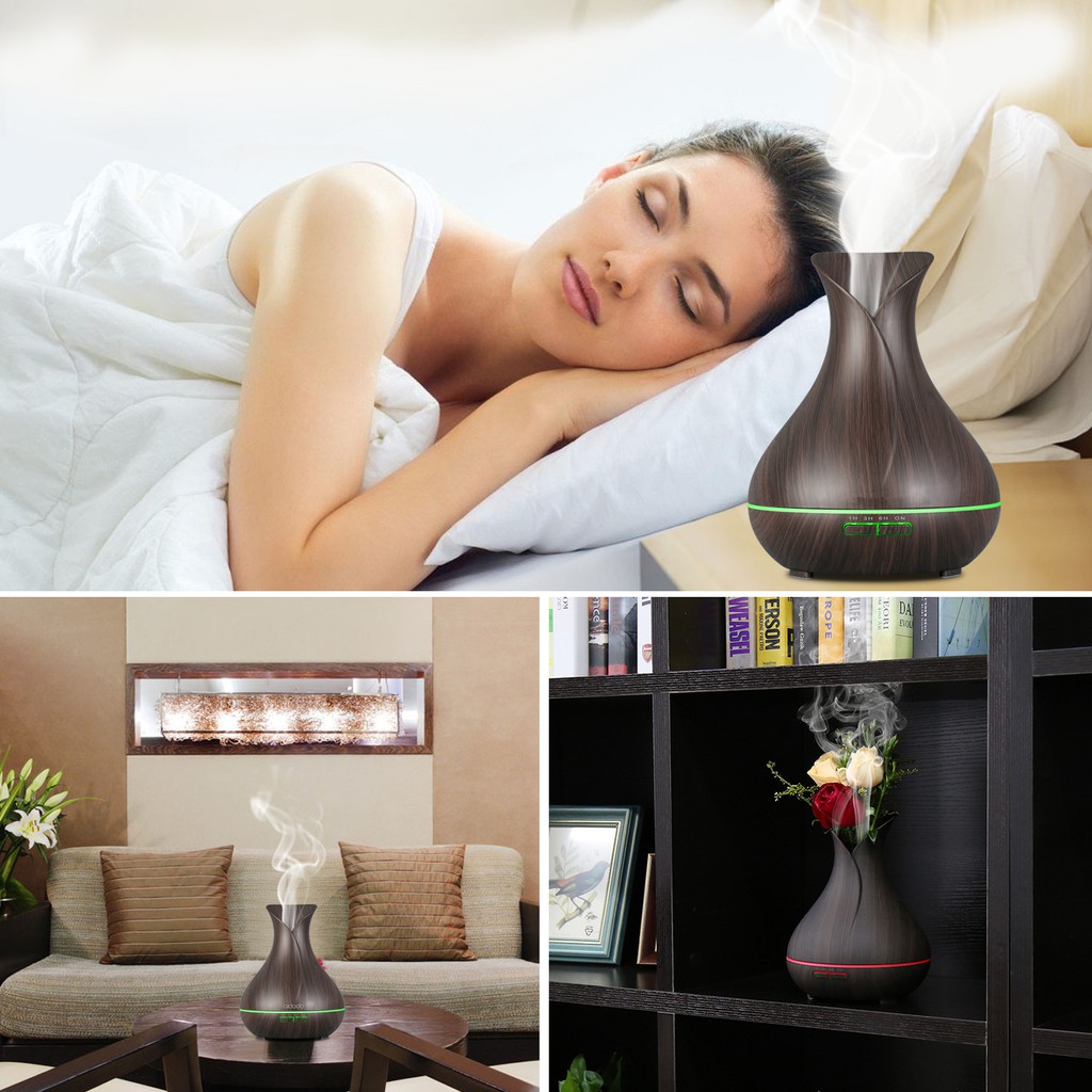 Freeship- Máy xông tinh dầu MKT 1803, Bình Hoa Tulip vân gỗ, dung tích 550ML, có điều khiển, đèn LED 7 màu, tặng kèm 2 lọ tinh dầu mua tại đây